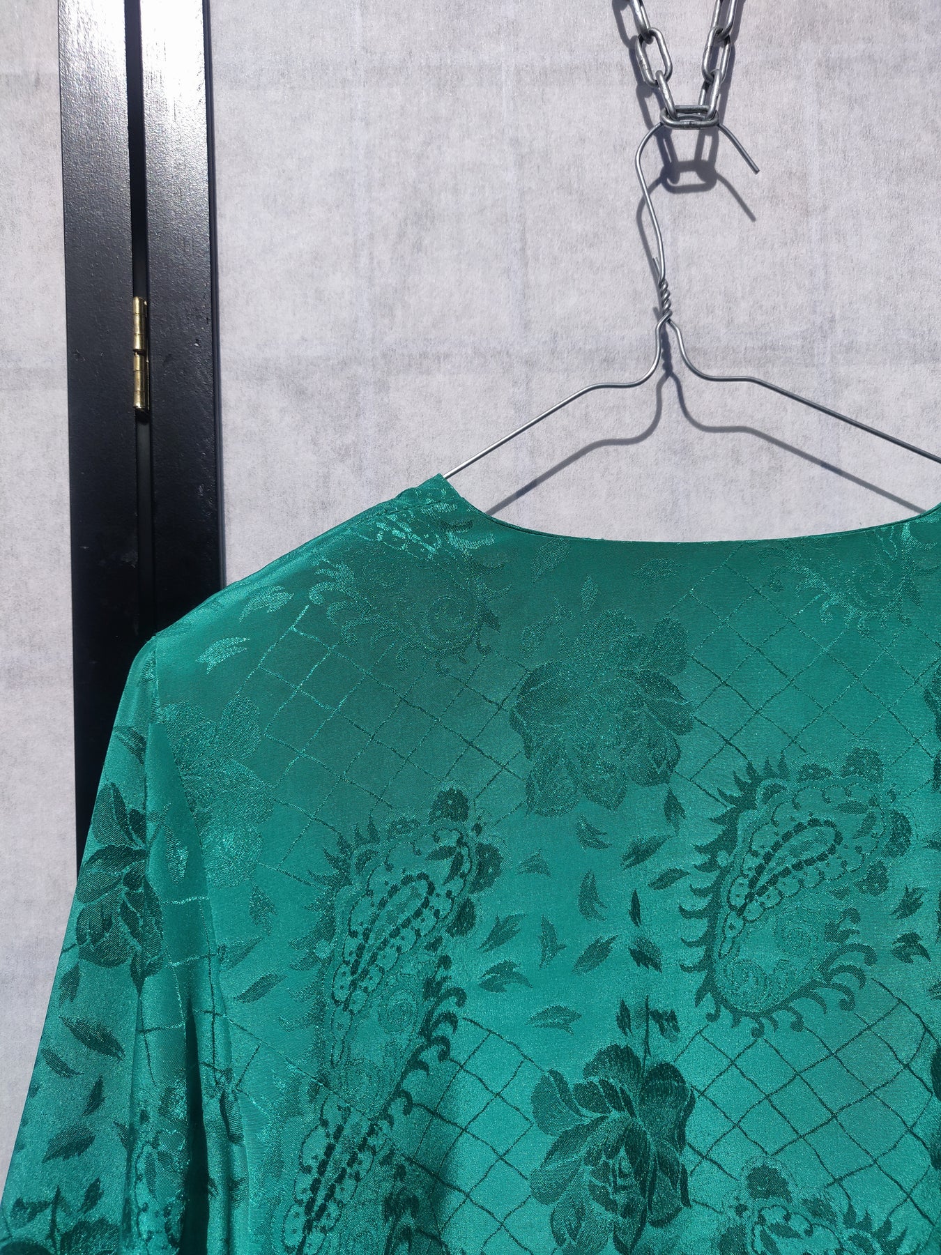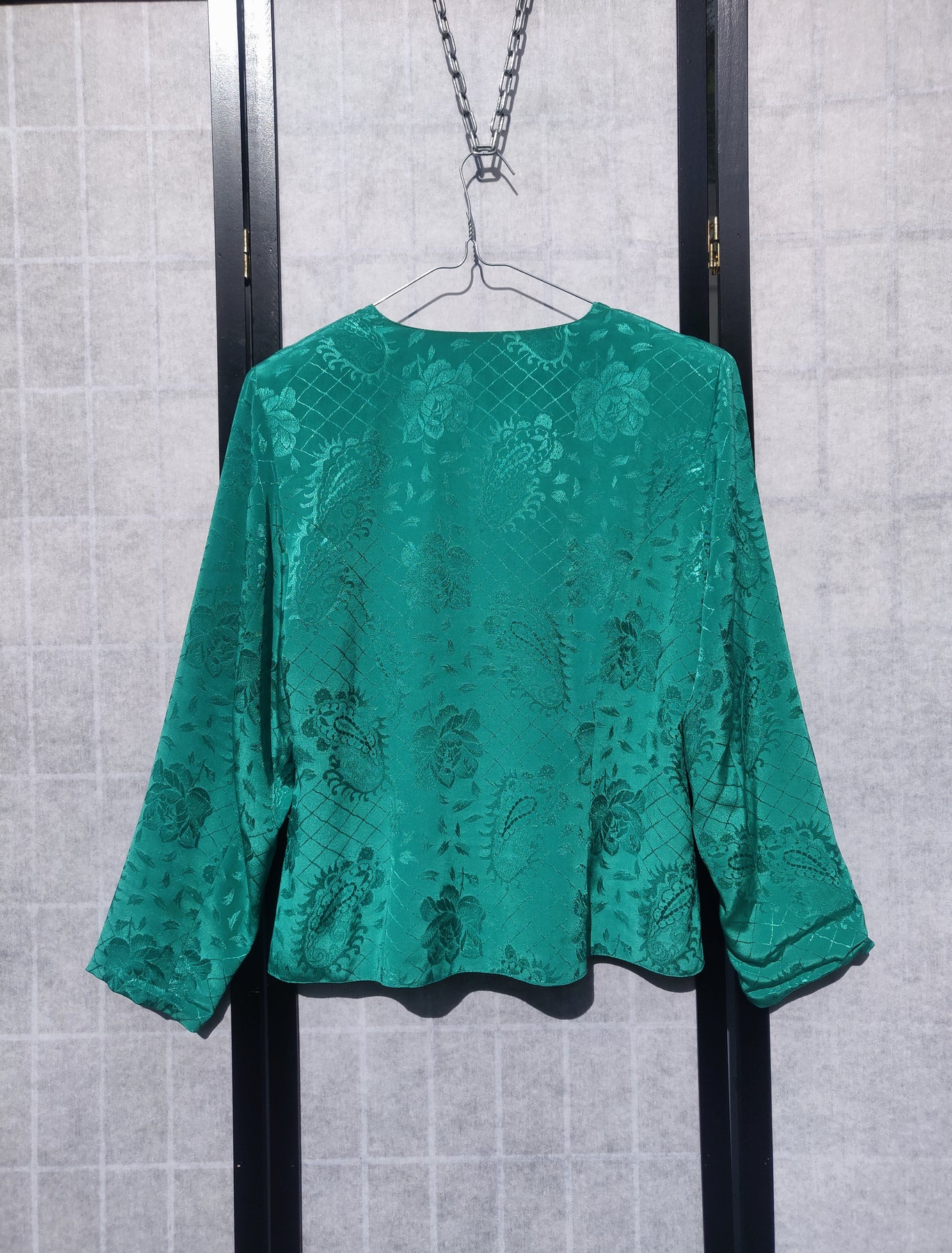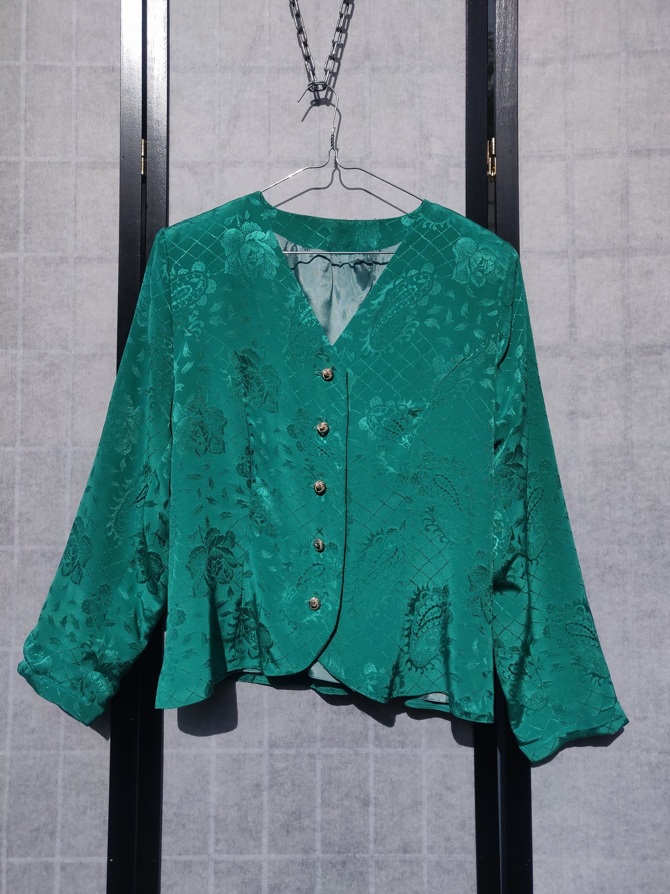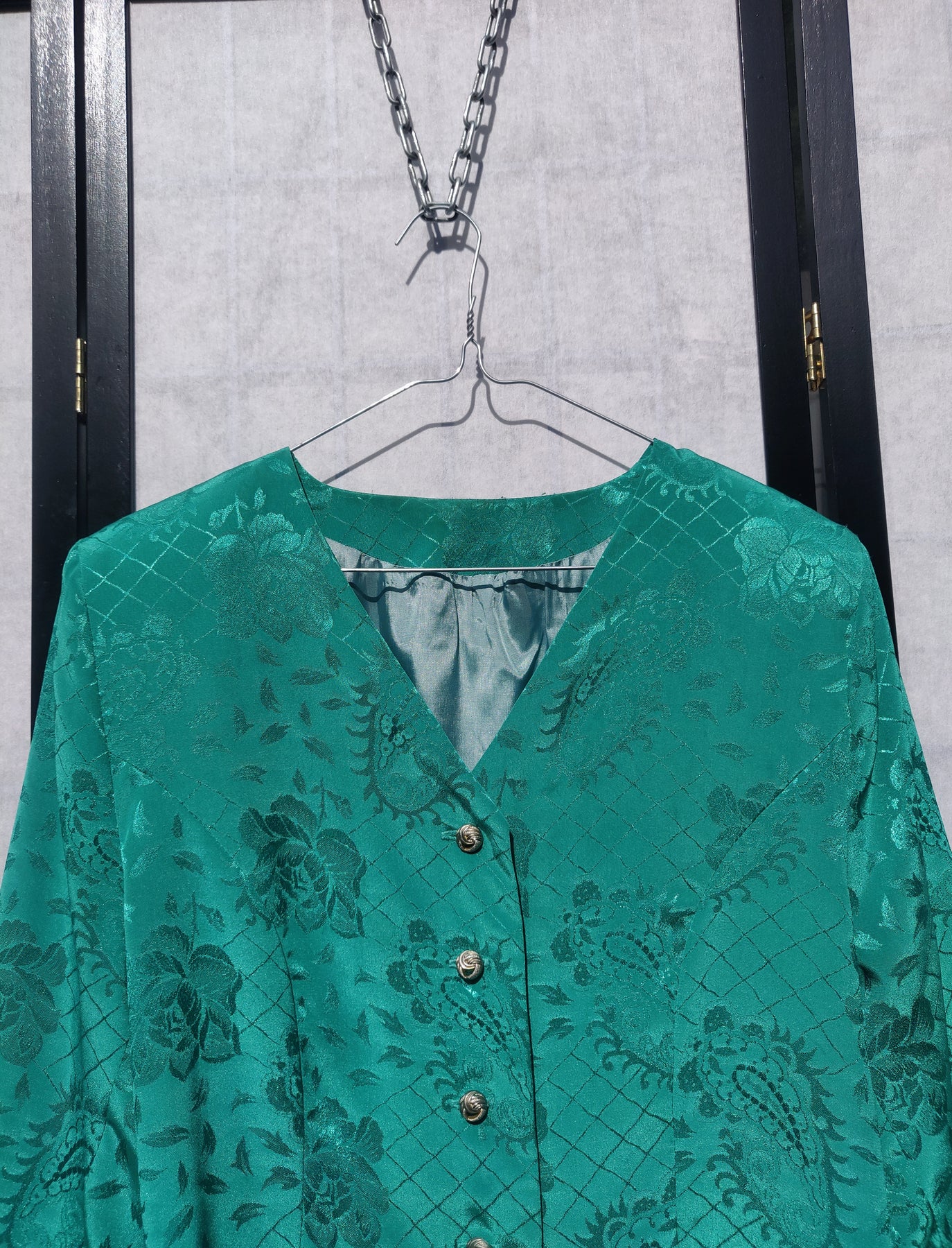Shiny and beautiful green colored blazer with a cool print and beautiful buttons on the front. Blazer has a shoulder pads. In a good condition. Check out the matching skirt also.