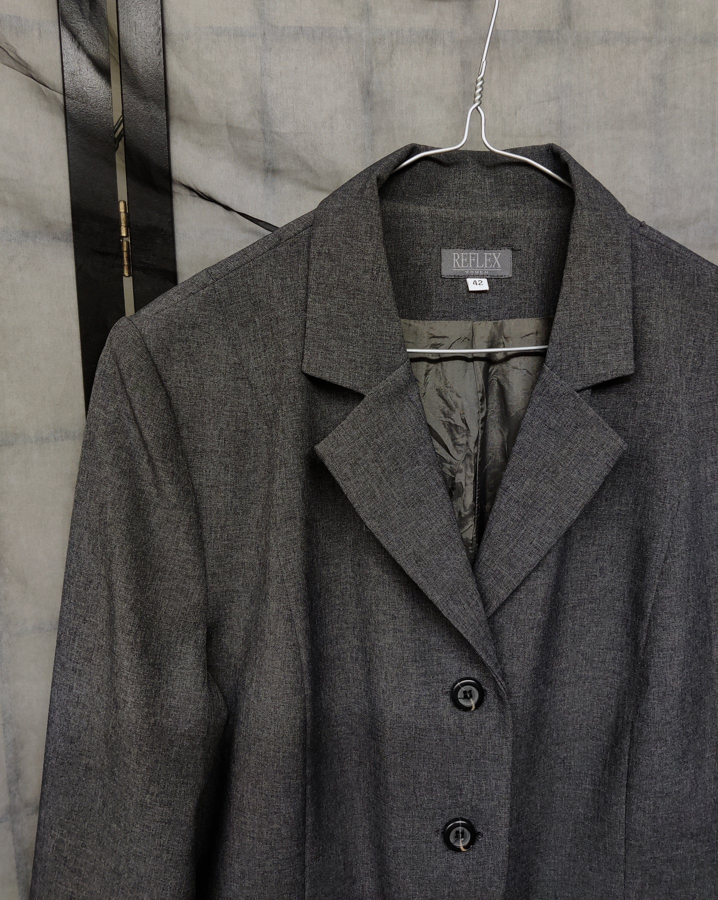 Classy and timeless dark grey colored blazer with buttons and pockets on the front. Blazer has shoulder pads and a slit at the back. In really good condition.