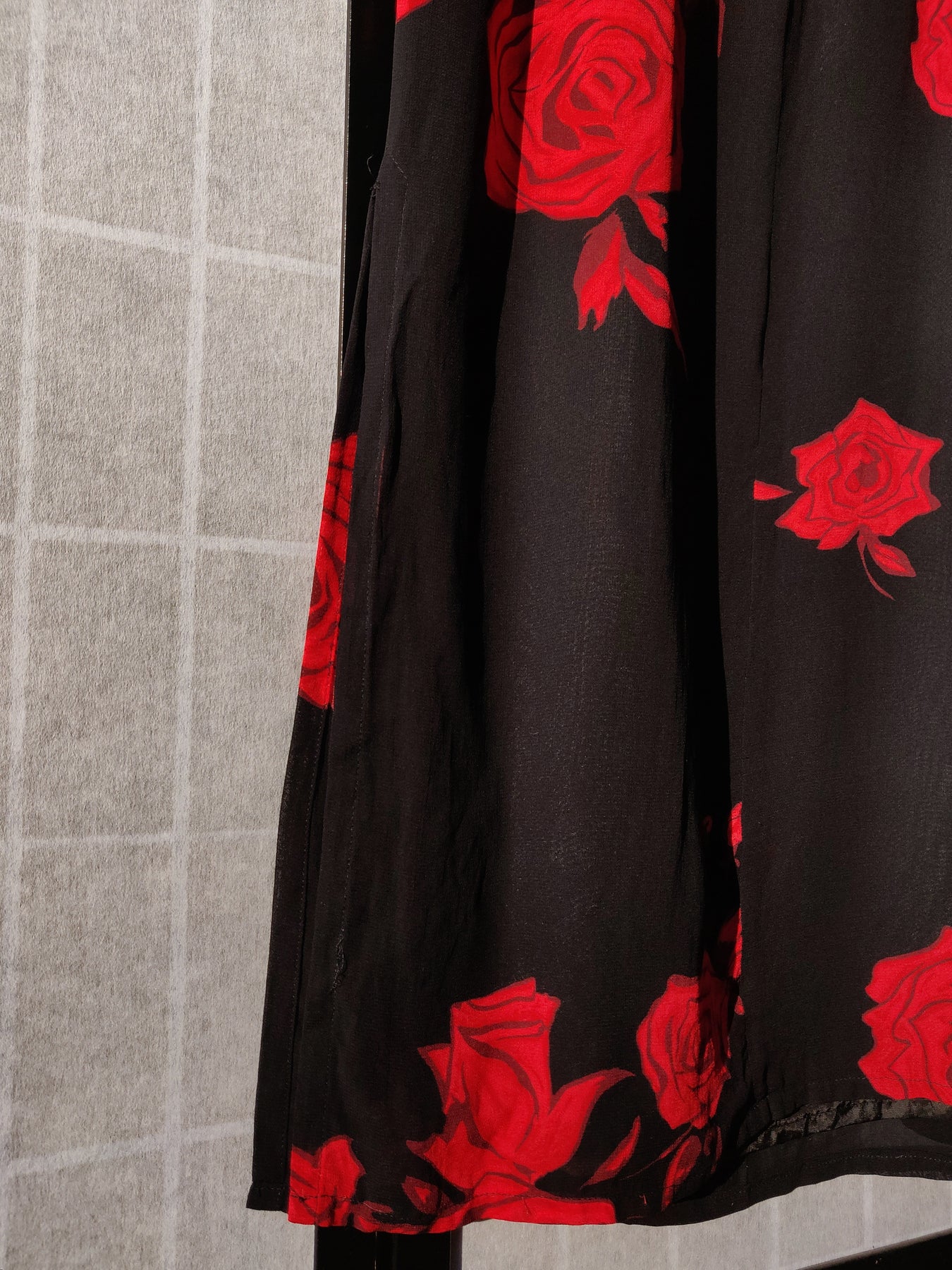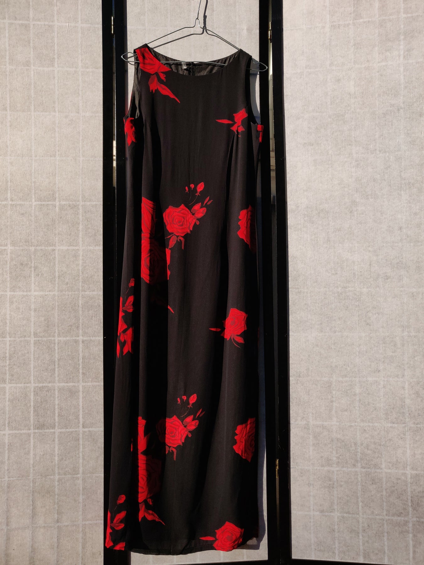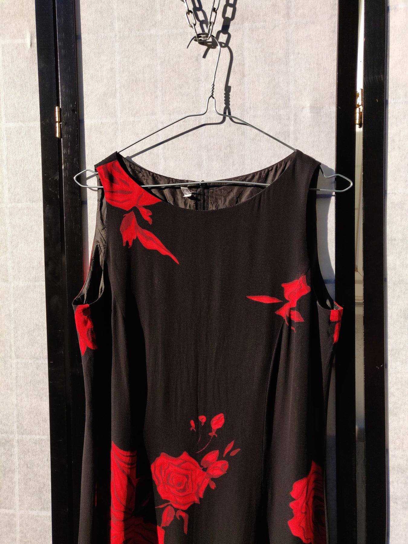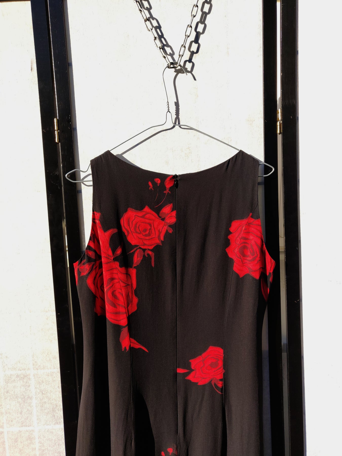 Elegant black colored dress with beautiful red rose details. Dress has a zipper on the back and a slit on the left side. In really good condition.