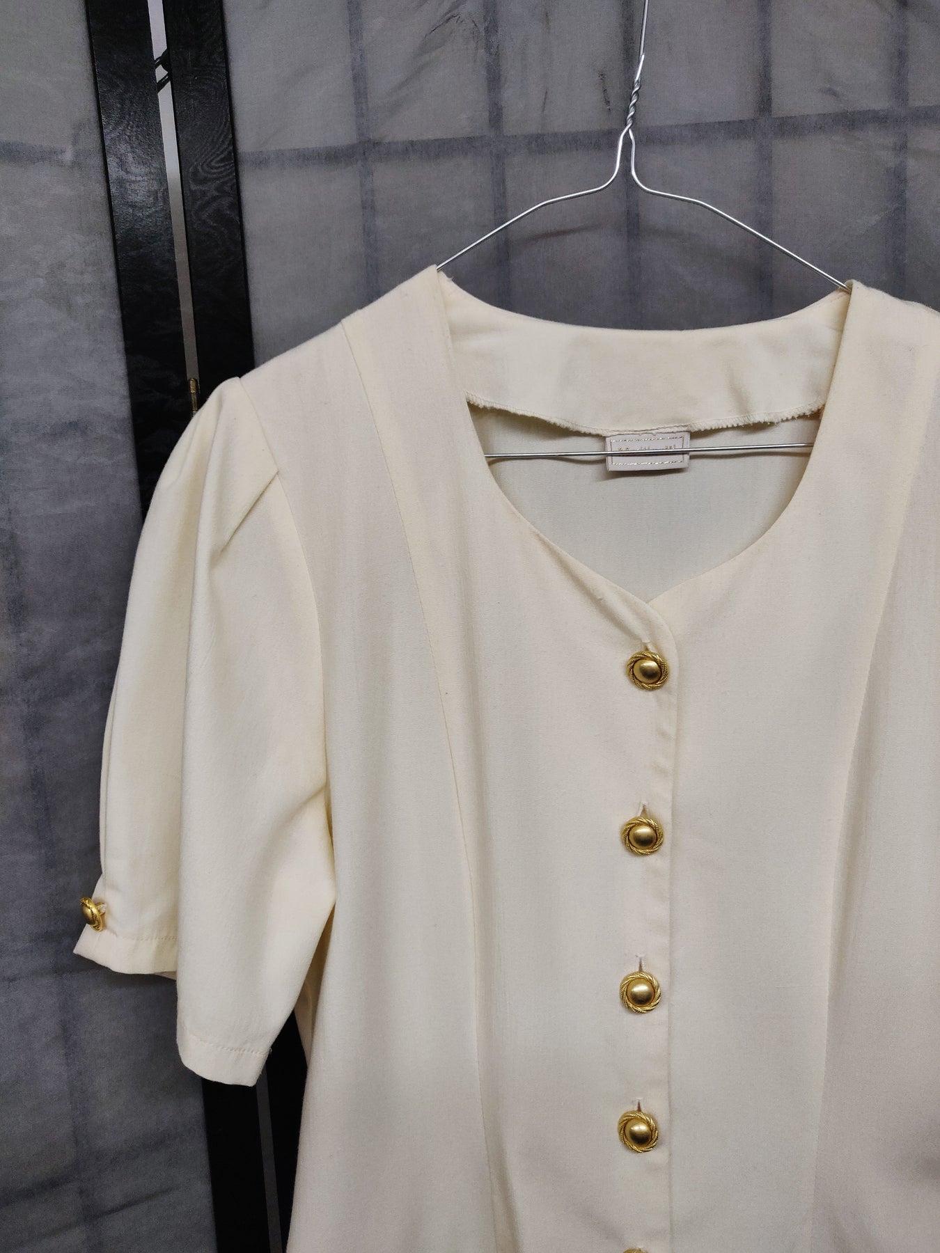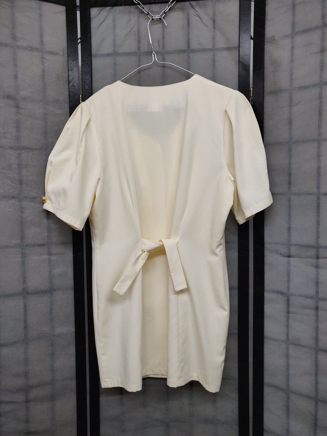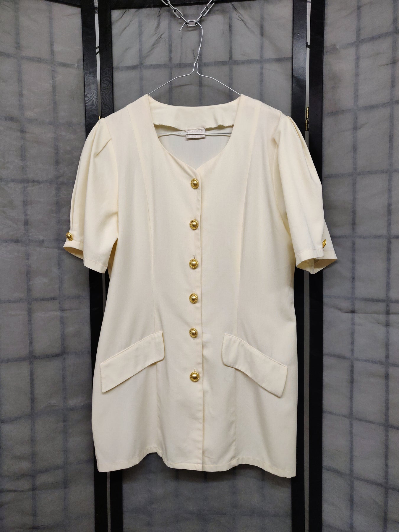 Elegant and cute ivory colored dress with beautiful golden buttons on the front and cuffs. There is a drawstring on the back. In really good condition.
