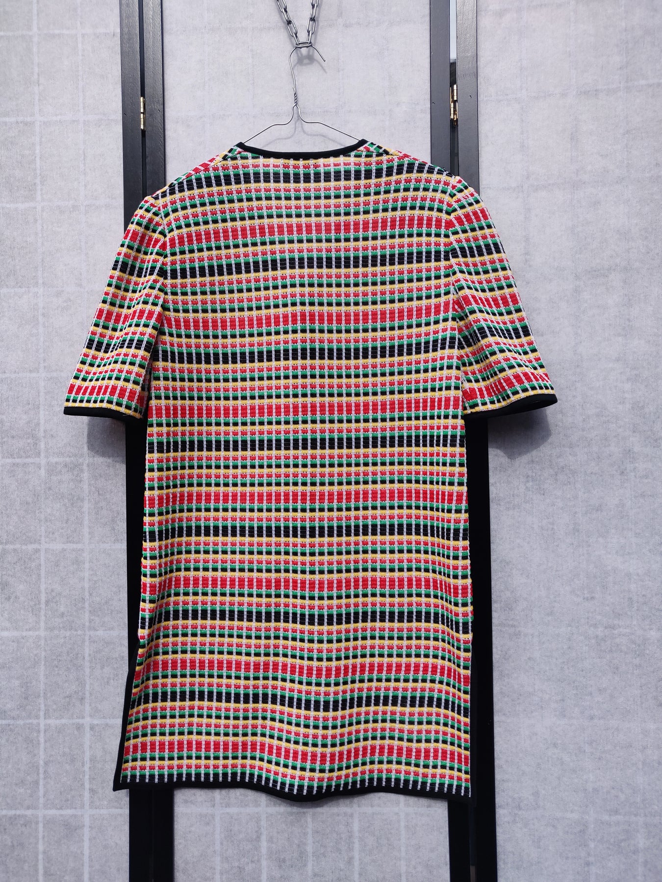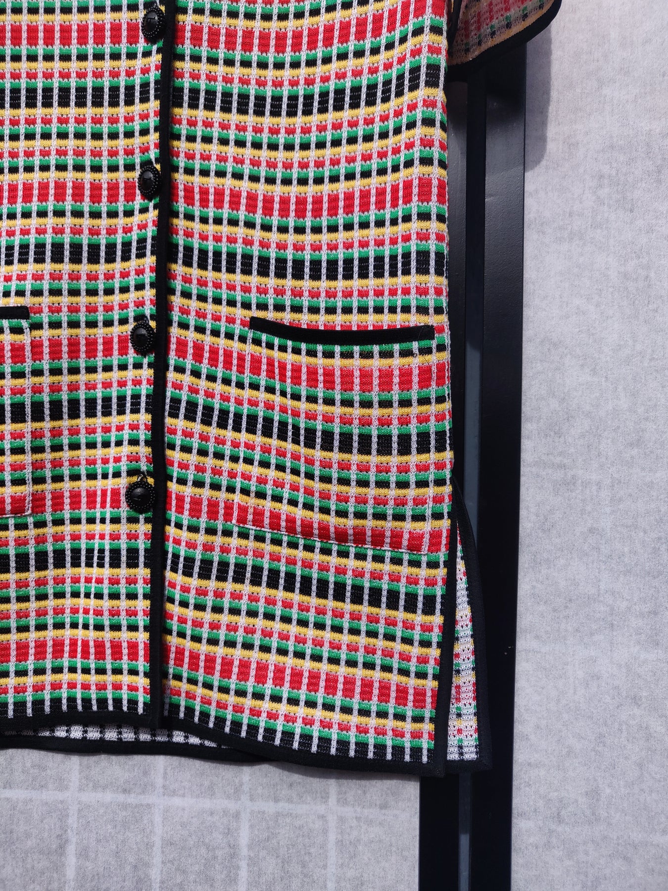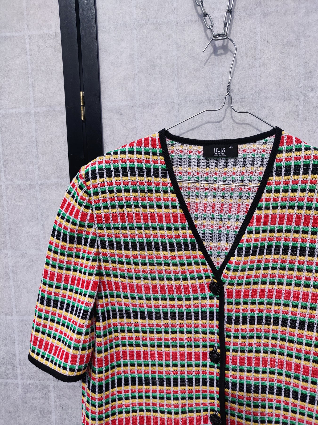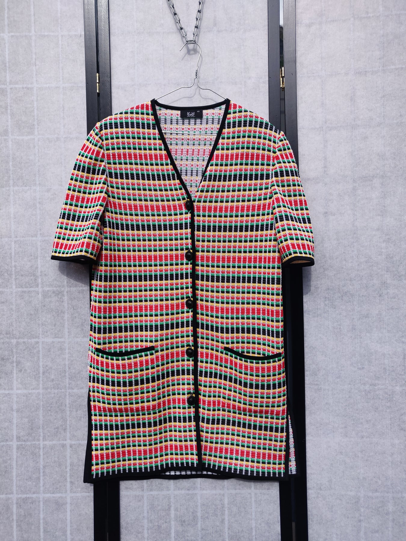 Cute and cool multicolored knit shirt with beautiful black buttons and pockets on the front. In a really good condition.